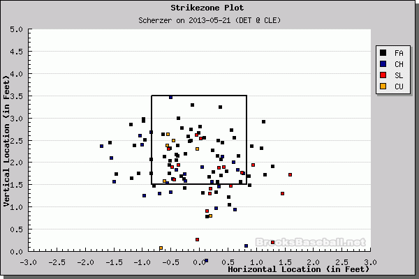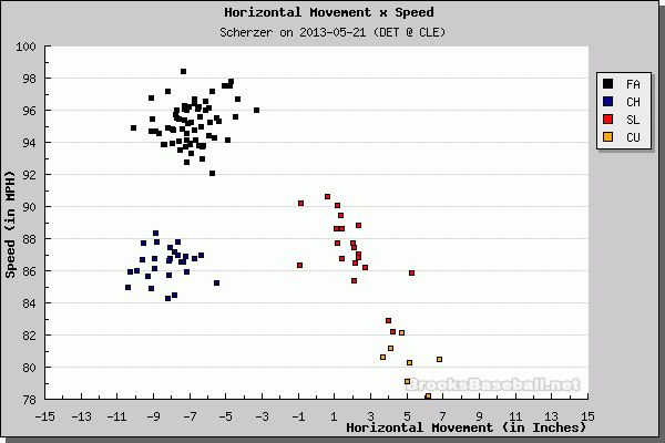 Last week, I spent some time breaking down Max Scherzer’s great start against the Indians and pointed out some factors that led to his success: 1) command of his fastball 2) better velocity 3) and increasing velocity in the late innings. But Scherzer was strong again yesterday and I took a quick peak as to why. Here are two things I found: