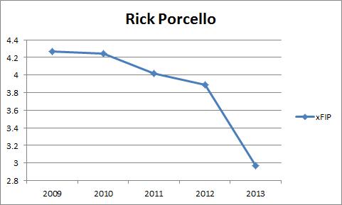 The Tigers sent Rick Porcello (3-3, 63 IP, 4.86 ERA, 3.67 FIP, 1.0 WAR) to the hill in the middle game of the series with the Indians today and things went exactly according to plan. Porcello continued to impress after allowing hits to the first two batters of the game, he allowed just 3 more baserunners before he left the game after 6 innings, 3 hits, 2 runs (1 earned), 2 BB, and 7 K. With another great start under his belt Porcello continues to compare himself nicely to the previous versions of himself and the rest of the league, as he now ranks 8th in xFIP with 2.97, which is better than any qualifying pitcher from 2012.