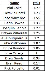 Obvious, some of these guys have fewer appearance than others, but you’ll note that Phil Coke, Jose Valverde, and Darin Downs have been called on during the most critical moments with Joaquin Benoit coming in 4th among pitchers who have a decent chunk of innings. What you should also notice is that Drew Smyly is effectively dead last because Reed and Porcello have hardly pitched at all.