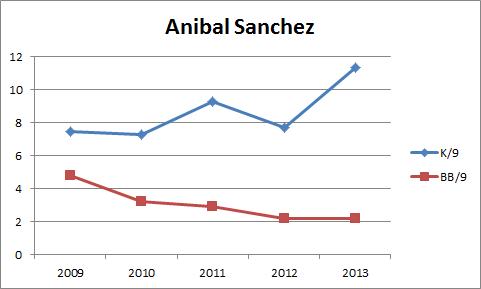 Anibal Sanchez has been a solid MLB starter for several seasons, so his breakout might be a little less surprising to you, but it’s not less impressive than what Porcello is doing. Here are Sanchez’s strikeouts and walks per 9 since 2009: