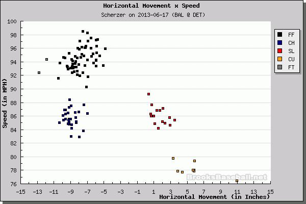 We’re at the point, where it is hardly news now when a Tigers starting pitcher throws a brilliant game. It was Max Scherzer (10-0, 96.1 IP, 3.08 ERA, 2.51 FIP, 3.1 WAR) who did it tonight, delivering a 6 inning, 1 R, 2 BB, and 10 K line with the only blemish being a homerun to Chris Davis. The Tigers rotation is on pace to be the best rotation in MLB history and Scherzer is now the 2nd best pitcher in the AL by WAR, trailing only King Felix, who has made an additional start. The Tigers offense came from a 2 run bomb from Cabrera in the 1st, a Jackson single in the 2nd, a Martinez sac fly in the 5th, and a Peralta single in the next at bat. Leyland even brought Smyly in at the right time to get 9 outs! But the moment of the night, no doubt, was Scherzer striking out Davis with the bases loaded to end the 5th inning. Here’s how he got him, with exceptional control and terrific velocity:
