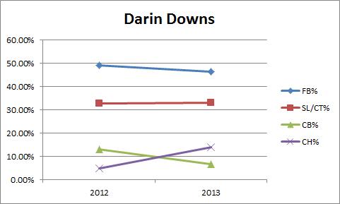 Notice how the changeup and fastball is moving more this season and notice how there is more separation between the fastball and the changeup. His pitchers are moving more and the separation has gotten a bit better. That’s generally a good formula for success. And I think Downs has figured it out. Here’s how he’s mixing his pitches: