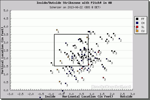 Despite the two early runs, Scherzer finished with a 7 inning, 6 hit, 2 run, 0 walk, and 6 strikeout evening, adding to his brilliant season and Cy Young campaign. Scherzer now leads all AL pitchers in Wins Above Replacement (WAR) with 3.3 (also in Run Support per 9 with 7.83). I mean, check this out. He threw almost nothing off the plate inside: