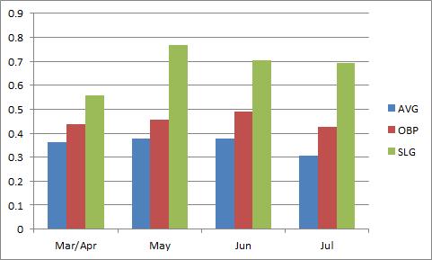 He’s probably not going to have a 225 wRC+ season, but it’s not like his bad months are anything at which to sneeze. We’re talking about a guy having an all-time offensive season and there are simply no signs that it isn’t sustainable. His BABIP (what’s BABIP?) is high, but it’s always been high and he’s already had a season in which he finished with this exact BABIP, .379. He has 30 homeruns before the All-Star break.