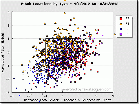 Coke did fine work against RHH in 2010 and has never had trouble with lefties. He’s not a lockdown arm, but he’s solid. This year, he’s actually back on pace with his 2011 numbers. He’s better against RHH this year but the overall results are worse. The strikeout and walk numbers tell the same story. His batted ball profile isn’t that different. His pitch mix is a bit interesting. He’s throwing more changeups this season and fewer breaking balls. His velocity is also not a problem.
