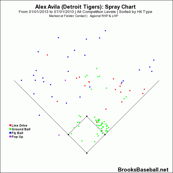 I’ve always though Avila was at his best when he took a short path to the ball and drove pitches to left center and he’s doing that again in a big way. Let’s draw the line at the wrist injury which puts about 190 PA on one side and 150 on the other. Neither is huge, but they aren’t way out of proportion.