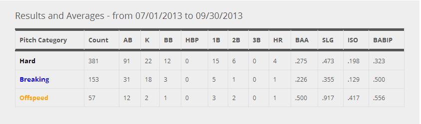 His batting average and slugging percentage are up against almost every type of pitch (only slugging against sinkers is down). Let’s simplify that and take a look at hard, breaking, and offspeed pitches: