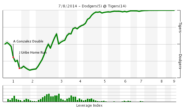 I adopted a dog in December, so during the 2014 baseball season I’ve occasionally missed watching the beginning of a game because the pup takes his evening way between dinner and the first pitch. Today was one of those days. Like, I have a cell phone and everything, so it’s not like I can’t follow the game, I just can’t watch on my TV. By the time I got to my couch, it was 3-0 Dodgers.By the time I sat on my couch, it was 5-0. That’s not good because Justin Verlander (19 GS, 122.2 IP, 4.84 ERA, 4.07 FIP, 1.7 fWAR) was pitching and we’re trying to get him going. He gave up five runs before I basically did anything! And then, miraculously, the Tigers jumped all over Ryu. They got all five back in the 2nd. Then they got two in the 4th. Then four in the 4th! Then one in the 5th! And two in the 7th! All the while, Verlander didn’t even allow a baserunner for a long time after that first inning and didn’t surrender another run. Even the bullpen didn’t allow a run over three innings. There’s quite a bit you could say (Cabrera tripled!!!!), but I think this might say it all.