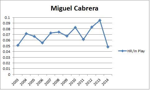 So far this season, Miguel Cabrera has hit 14 HR in 387 PA. For most human beings, that’s a very nice first half and puts him on pace for close to 30 over a full season. But Miguel Cabrera is Miguel Cabrera. He’s only hit 30 or fewer bombs in a season twice. Don’t get me wrong, he’s still on pace for an excellent season, but the absence of home runs is interesting, even if it isn’t concerning. Right now, he’s hitting a home run in about 3.4% of his trips to the plate, which is the lowest mark since his half season callup in 2003. And plate appearances probably isn’t the right denominator here because we’re not really concerned about all of his trips to the plate, just the ones in which he puts the ball in play. His strikeouts are fine and his walks, while down compared to last year, are still within his career norms. Let’s look at home runs on contact: