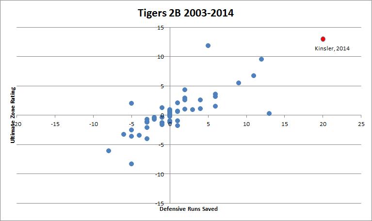 Sure, he was a solid offensive performer (102 wRC+), but he’d been just about this good for the last couple of years and Prince would obviously have been better if healthy. Two things stand out about Kinsler’s 2014 season. The first was his terrific base running (9.1 BsR), but the second, and our focus here, was his superb defense at the keystone.