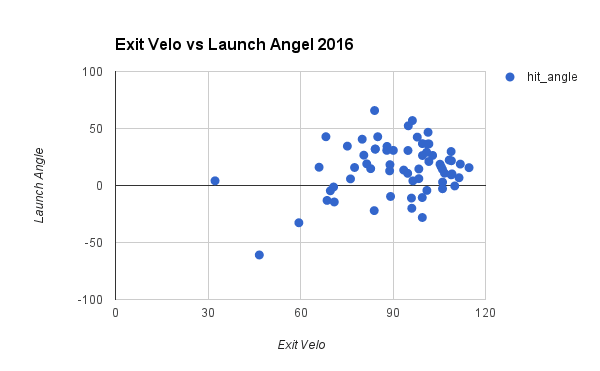 It’s obviously a much smaller number of balls in play for 2016, but the general shape of the chart looks the same. We could run an expected ISO using the Statcast data, but it looks to me like he’s probably just hit a few more ground balls this year when he would have otherwise elevated them last year. He’s averaging a launch angle of around 15 degrees this year when it was 16 last year. Could this be a minor problem that is costing him a little power? Sure, but it’s way to early to think it’s anything more than normal batted ball variance.