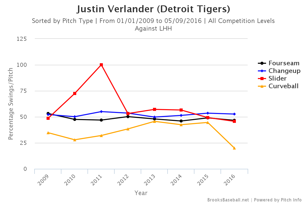 Here’s the thing about this graph, I don’t know if it’s good or bad. It seems like you’d want batters swinging at your breaking balls because that’s where you might get a lot of chases, but some of the best Verlander years occurred when teams didn’t swing at his breaking balls. This is one of the interdependent things that won’t be easy to parse.