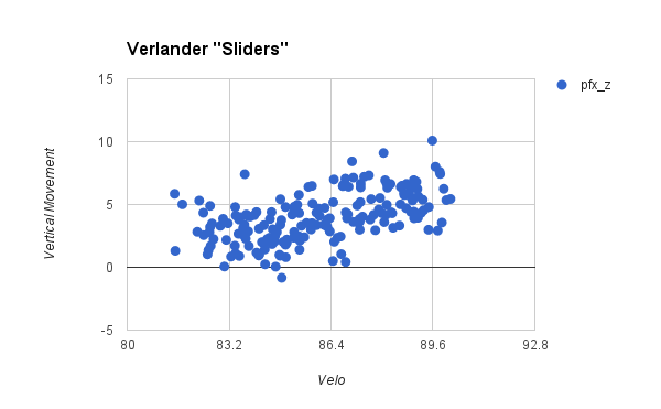 Here’s a plot of individual pitch velo and vertical movement for his “sliders” this year: