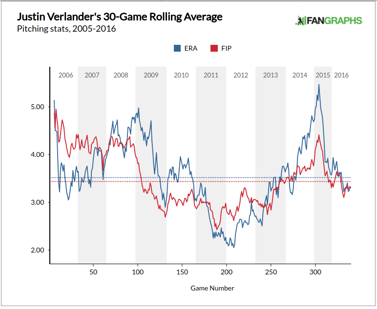 If you like things in graph form, here it is. This looks less impressive though, because ERA and FIP aren’t league adjusted like the minus stats in the table. There’s a lot more run scoring in the game in 2016 than there was in 2013, but still it looks cool. The peak is July 19, 2015.
