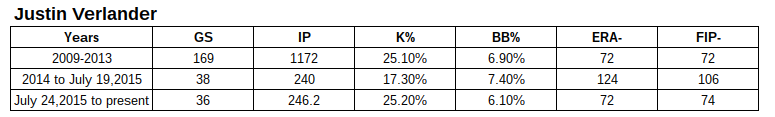 Between the start of 2014 and July 19 of last year, Verlander had a 124 ERA- spanning 240 innings. While we typically don’t lean on ERA too much at this site, any time you’re allowing 25% more runs than average over more than a full season, it’s not exactly a good thing. And while his FIP- sat at 102 over that period, that’s not the ace the Tigers had come to know.