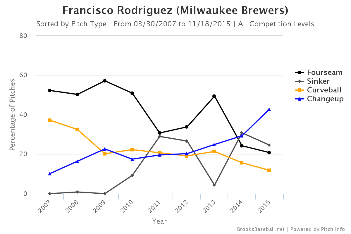 The 2014 spike is 7 innings, so you can see how it became a much larger part of his arsenal in 2015 compared to years past. More strikeouts, fewer walks, fewer dingers, fewer runs. He was the whole package.