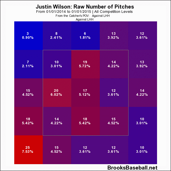 Wilson is primarily going to throw a fastball around 95-96 and a cutter around 91-92, while also mixing in a few sinkers. You might even see 98-99 when he really needs it. That kind of power from the left side is pretty rare and he’s used it well. One thing you’ll notice is that in 2015, compared to 2014, Wilson kept the ball down and away when facing lefties.