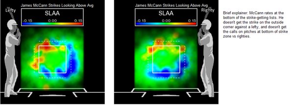 McCann seems capable of keeping high strikes in the zone and balls that come to his right, but pitches to his left (i.e., inside to righties and outside to lefties) seem to give him trouble along with low pitches in general. As I noted in the piece last summer, there are plenty of reasons a young catcher might struggle with framing without being a bad framer, but it would be hard to argue he didn’t struggle.