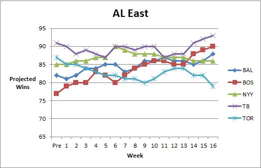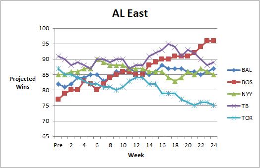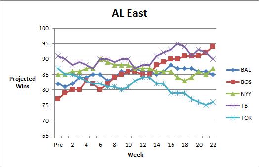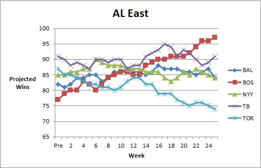 In case you missed it, in April we launched our Dynamic Standings Projection feature on New English D. A full explanation of the methodology can be found here or by clicking the tab at the top of the page. This project seeks to provide a reasoned and cautious approach to updating our beliefs about the baseball future. You can find a summarization of the original projections here. You’ll notice a column on the far right that indicates the difference in projected wins from the preseason prediction. Positive numbers mean teams are now projected to win more games and negative numbers mean a team is now projected to win fewer games. You’ll notice a series of graphs below the standings section that track how the projections have evolved over the course of the year.