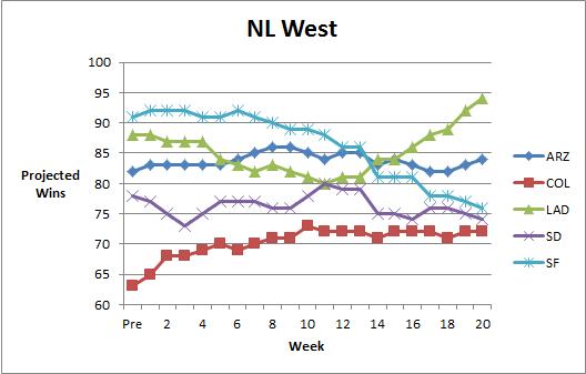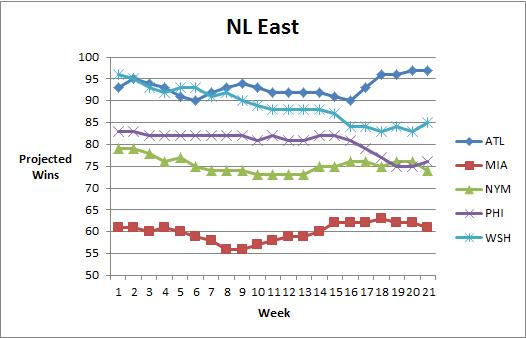 This Dynamic Standings Projection is updated through the August 21 games. Note that DSP posts have been moved to Thursday accommodate something that won’t interest you.