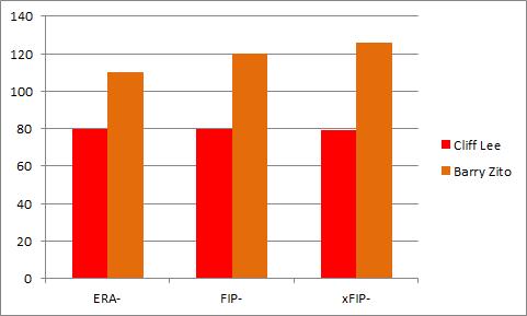 Let’s start with something as simple as ERA. In Wins, Losses, and ND, Cliff Lee allowed fewer runs than Zito despite pitching his home games in a park that skews toward hitters and Zito in a park that skews toward pitchers: