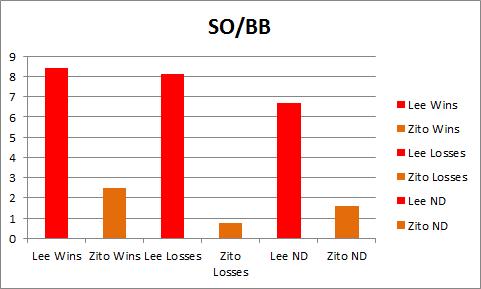 In fact, Lee’s ERA in Losses is almost identical to Zito’s in No Decisions. He allowed the same number of runs when he pitched “poorly” enough to lose as when Zito pitched in a “neutral” way. If we take a look at strikeout to walk ratio, it looks even more lopsided: