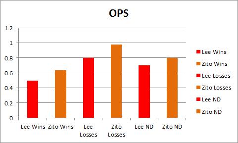 Again we find that Lee pitches as well in Losses and Zito does in No Decisions and performs much better across the board. Not only does Lee allow fewer runs in each type of decision, he has a better K/BB rate, and a lower OPS against in pitching environments that should favor Zito.