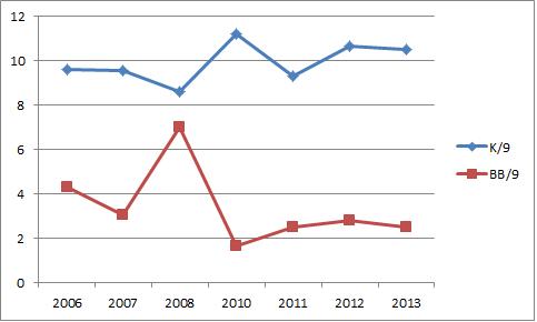 You can see he’s been above average for the most part in his entire relief career. 2010 was his golden season, but 2013 is pretty darn close. For a reliever, strikeouts and walks are key and he’s made some nice gains over time: