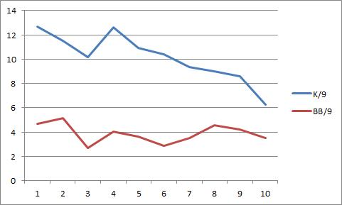 Allow me to illustrate this with a graph. Here is Valverde’s strikeouts per 9 and walks per 9 over his ten major league seasons: