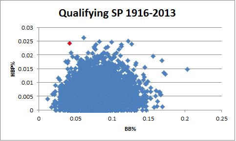 Think of it this way, from 1900-2013, the average pitcher hits 5 batters a season and walks 68. Even in the smallest of samples, it’s pretty extraordinary to find a period in which a pitcher is hitting more than he is walking, and these statistics include eras in which walks were much less common. Even in data that includes the 2013, which will bias the data away from these results, I calculate a chance that a pitcher would finish a season with more HBP than BB between 0.5 and 2 percent if this process played out at random. Here is a graph of HBP-BB with 2013 included, which will include pitchers like Wainwright this year who just haven’t walked many batters because they are good and it’s only been six weeks: