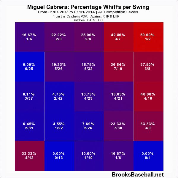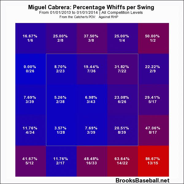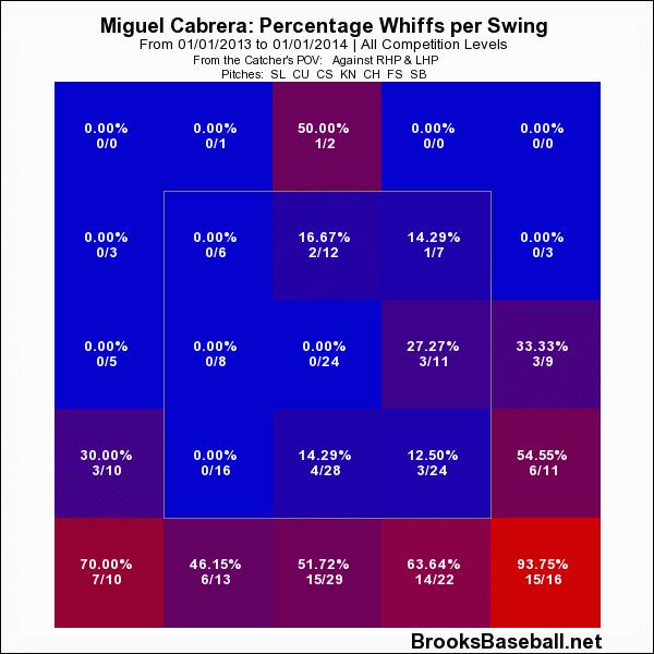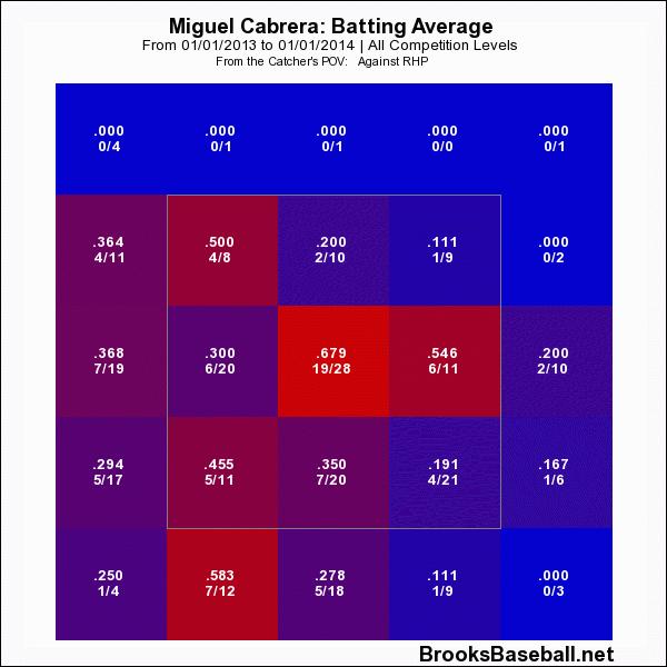 From here, we’re going to breakdown the approach using Cabrera’s plate appearance data against RHP from 2013 because he’s presumably adapted throughout his career, so we shouldn’t try to get the 2009 version of him out. Let’s go for it.