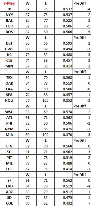 In case you missed it, last month we launched our Dynamic Standings Projection feature on New English D. A full explanation of the methodology can be found here or by clicking the tab at the top of the page. This project seeks to provide a reasoned and cautious approach to updating our beliefs about the baseball future. You can find a summarization of the original projections here. You’ll notice a column on the far right that indicates the difference in projected wins from the preseason prediction. Positive numbers mean teams are now projected to win more games and negative numbers mean a team is now projected to win fewer games.