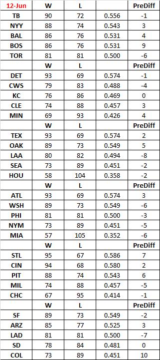 Here come the Pirates, who are all but assured a winning record for the first time in two decades. But they have the 18th best offense and 19th best pitching staff in baseball. The defense has been good enough to help out, but they are playing over their heads. I don’t think they’ll fall back into oblivion, but I don’t think they’ll have the best record in baseball for the entire season. They’re a borderline wild card team for me, but there’s no shame in that.