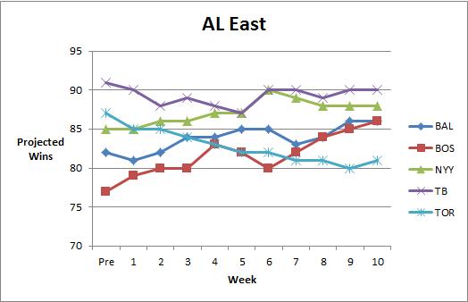 In case you missed it, in April we launched our Dynamic Standings Projection feature on New English D. A full explanation of the methodology can be found here or by clicking the tab at the top of the page. This project seeks to provide a reasoned and cautious approach to updating our beliefs about the baseball future. You can find a summarization of the original projections here. You’ll notice a column on the far right that indicates the difference in projected wins from the preseason prediction. Positive numbers mean teams are now projected to win more games and negative numbers mean a team is now projected to win fewer games. You’ll notice a series of graphs below the standings section that track how the projections have evolved over the course of the year.