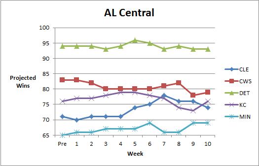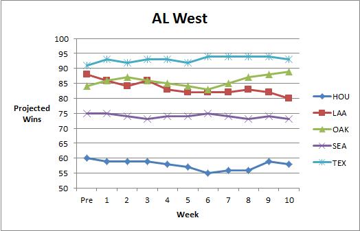 I was a bit bullish on the Padres going into the season, but their below average offense and league worst -1.4 pitchers’ WAR doesn’t have me feeling great about that pick. They missed Headley for a couple weeks, but there just isn’t enough on this roster to keep them from sliding 4 spots.
