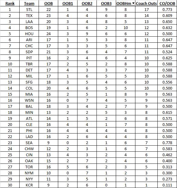 I haven’t spent enough time with these numbers to really know if it reflects the quality of the team’s third base coach, but I suspect it does. The coach can’t make his runners faster, but he can know which players are capable of taking the extra base and only telling them to advance. They don’t always listen, but a good third base coach should be able to make them. Seattle makes the highest percentage of their baserunning outs at 3B and home, so their coach could probably do more to help. Ideally, you would want to have all zeroes on this board, but the columns showing 3B and home are categories in which the coach plays a role and should therefore be judged. I’ll be thinking about this more and working on a way to further isolate this going forward. If you have suggestions, let me know.