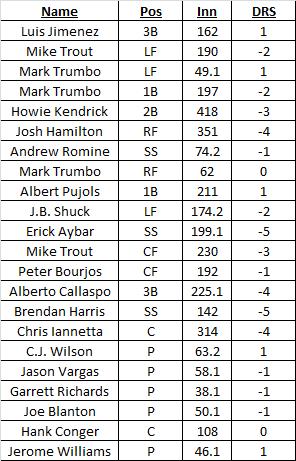 I’d have said the Astros before I looked it up, but it’s the Angels. The Angels! They’re -37 DRS, -16.1 UZR, -10.3 UZR/150 which are all 30th best in the league. That seems really crazy to me given some of the great defenders they have, but with their overall struggles, some must be leaking into the defensive side. Let’s look. I set the minimum innings to 30 at a position and looked at the leaderboard. Here it is: