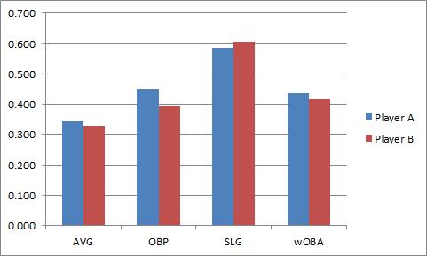 As you can see, Player A leads in average, OBP, and wOBA (what’s wOBA?) and is just a but behind in slugging. In wRC+, Player A leads 177 to 166 over Player B. If we take a look at BB% and K%, Player A looks much better.