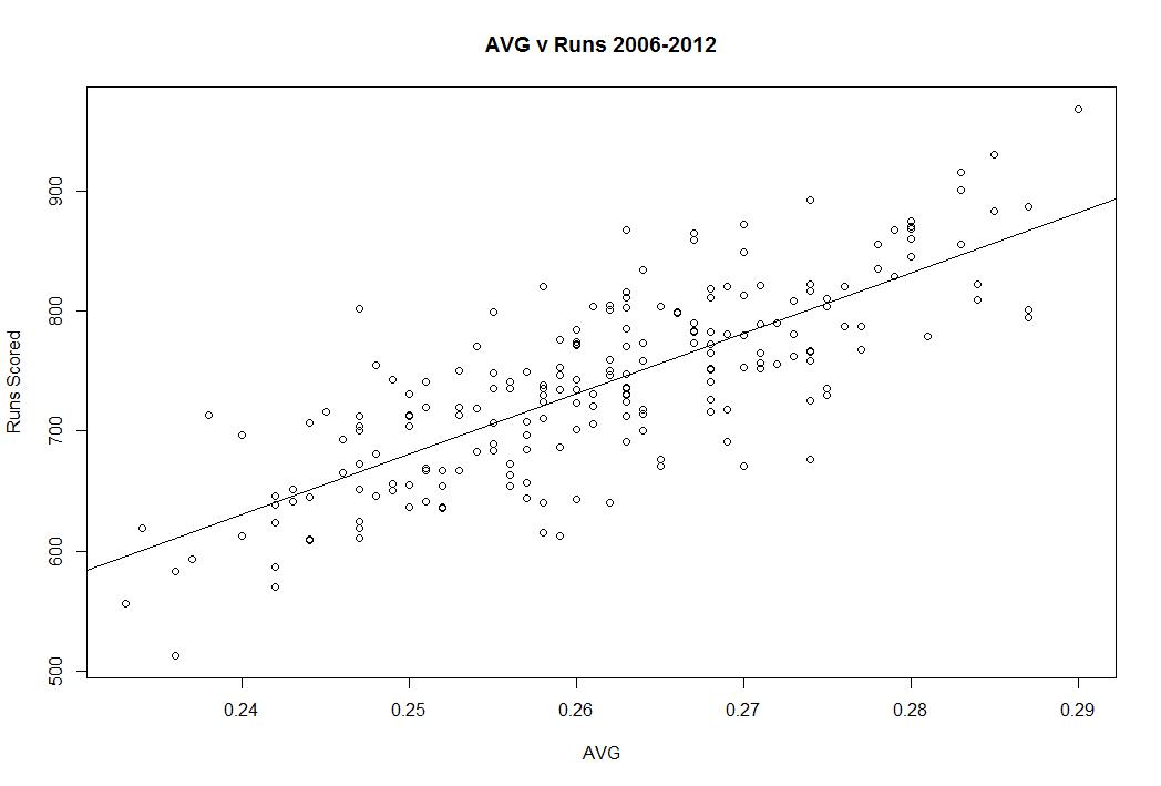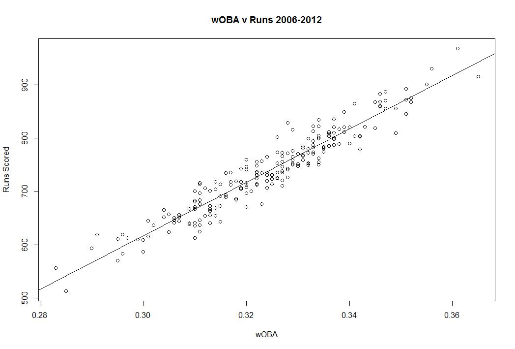 If you’re interested in going further, take a look at wOBA, because wOBA’s adjusted R squared is .9077, which is a lot better. wOBA tells you more about runs scoring than AVG and even more than OBP. Here it is in graphical form: